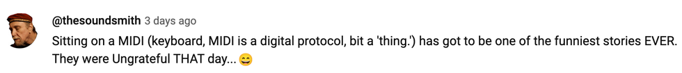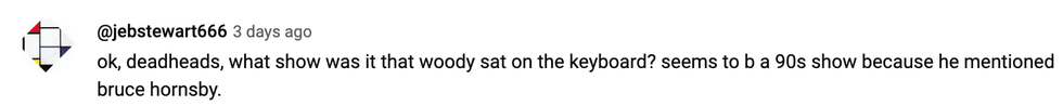 Harrelson then noticed that a number of The Grateful Dead's roadies were running in his direction and cursing at him, just as Hornsby informed him that he was, in fact, the source of the unusual sound: