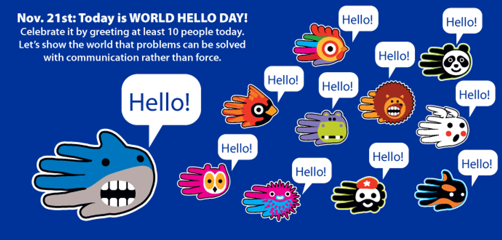 Celebrated on Nov. 21, World Hello Day is an annual attempt at promoting communication over force. To do so, participants are encouraged to greet at least ten new people. Whether those greetings turn into lasting conversations isn’t entirely relevant as the point of the holiday is to reach the attention of world leaders, who tend to veer more towards forceful resolutions.