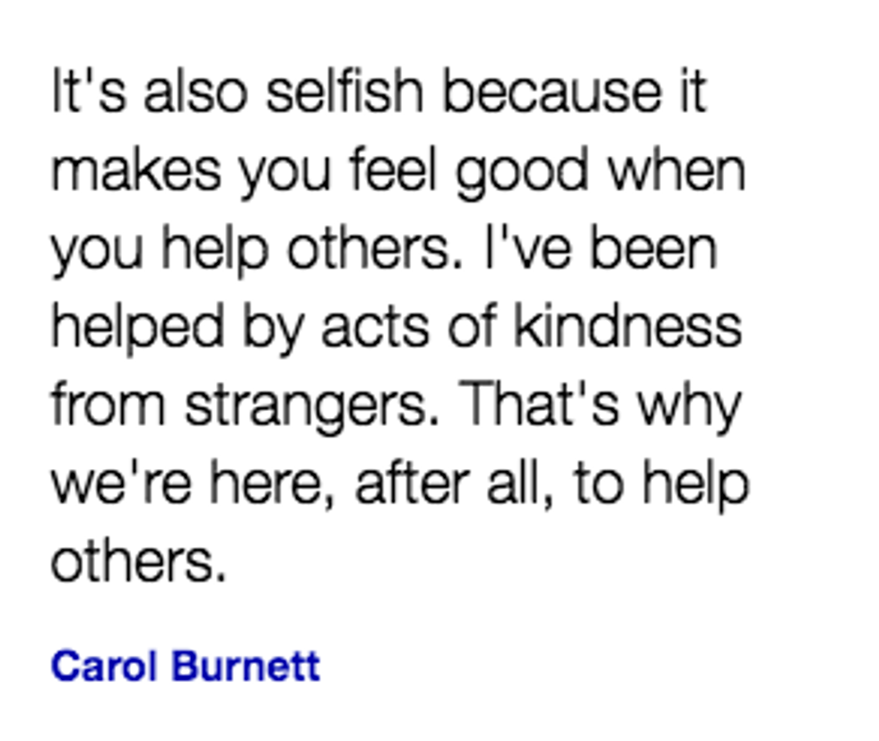The gestures don't need to be big to be meaningful: donating clothing, food, or books is nice, as is holding the door for a stranger, leaving an extra tip with your dinner, or even complimenting your mother's newest blouse are all ways one can celebrate World Kindness Day. To encourage you to go after a small, random act of kindness this Monday, here are a few quotes to get you in the spirit: