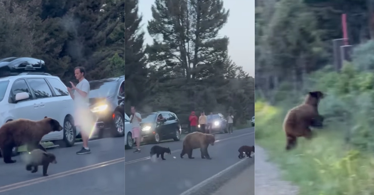 Visitors at Yellowstone National Park were stunned when a tourist stood in the way of a cinnamon-colored black bear and her cubs as they crossed a road and continued to record them on his phone even as the mom moved closer to put distance between the man and her cubs.