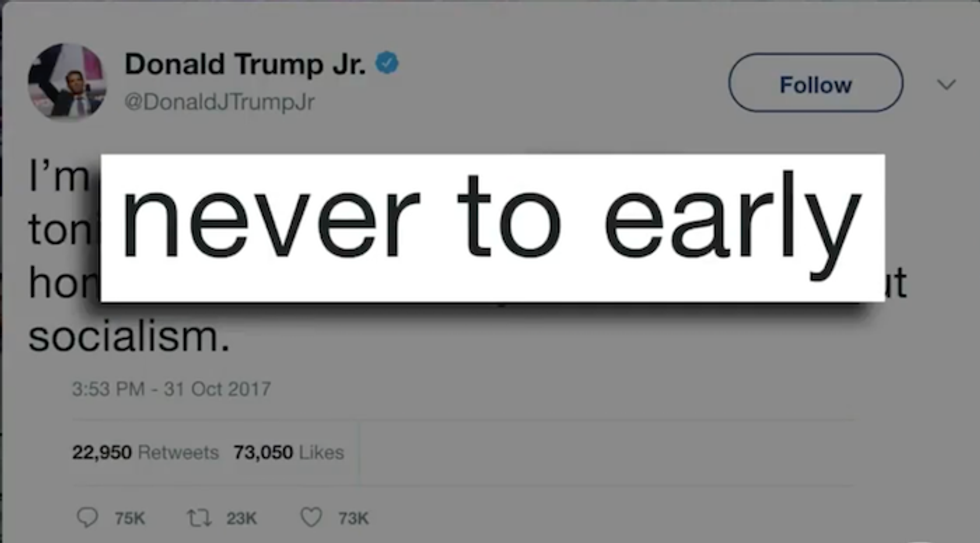 The tweet that started it all was when Don Jr. posted a photo of his daughter Chloe looking dejected holding up a half-empty bucket of Halloween candy. He captioned the photo, saying, "I’m going to take half of Chloe’s candy tonight & give it to some kid who sat at home. It’s never to [sic] early to teach her about socialism."
