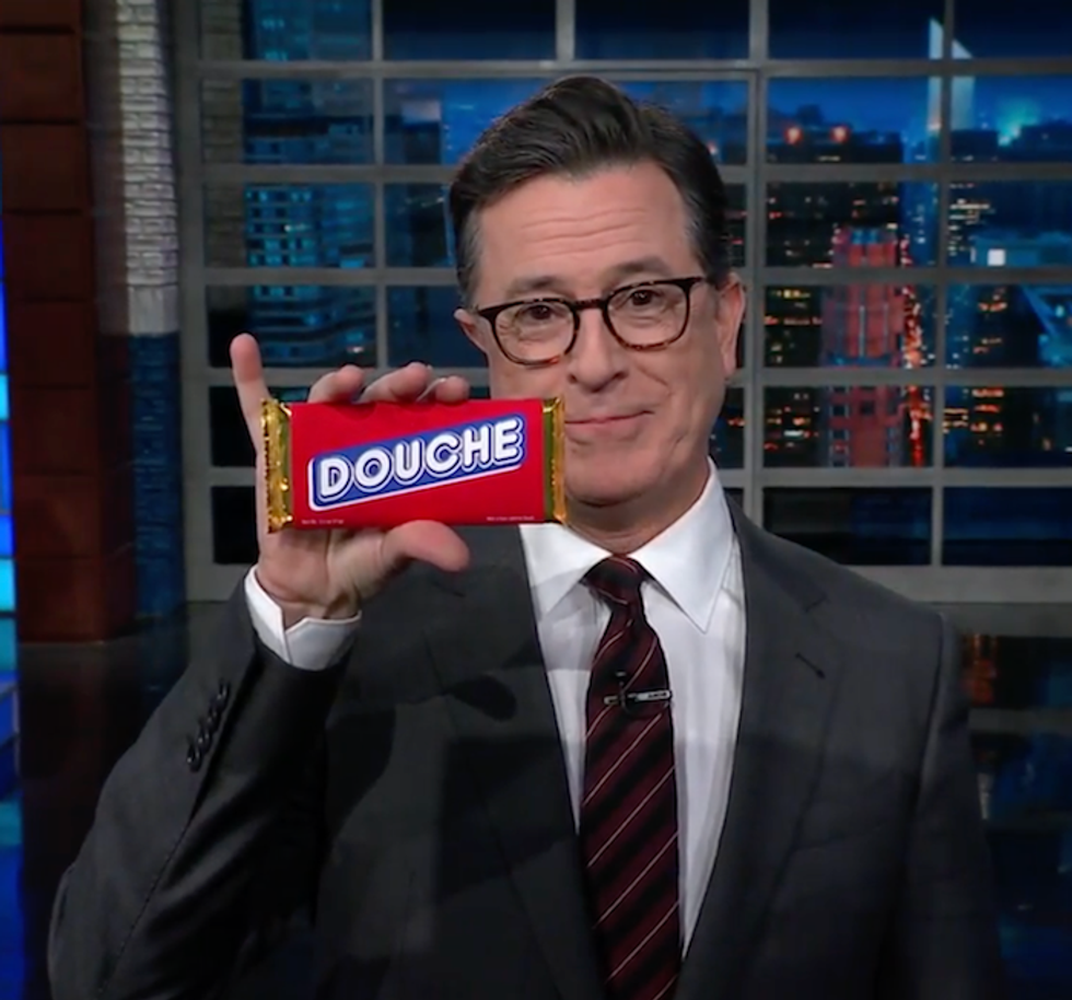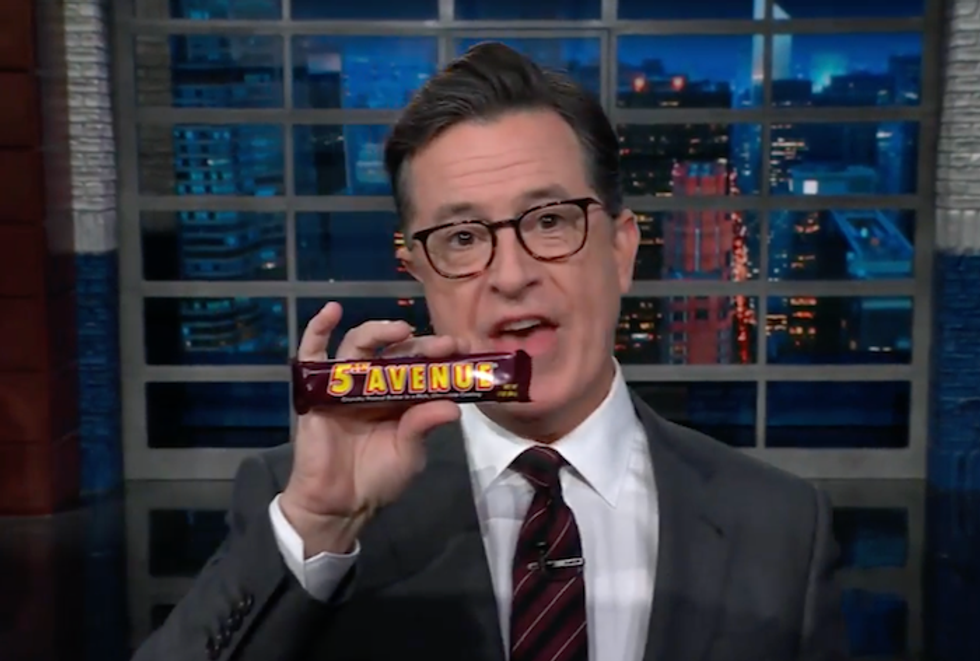 Holding up a box Junior Mints, he addressed Donald Trump's eldest son. "You, 'Junior,' were born with many '100-Grand,'" Colbert said, while replacing the chocolate mints with a bar of 100 Grands and completing the statement with, "On '5th Avenue.'"