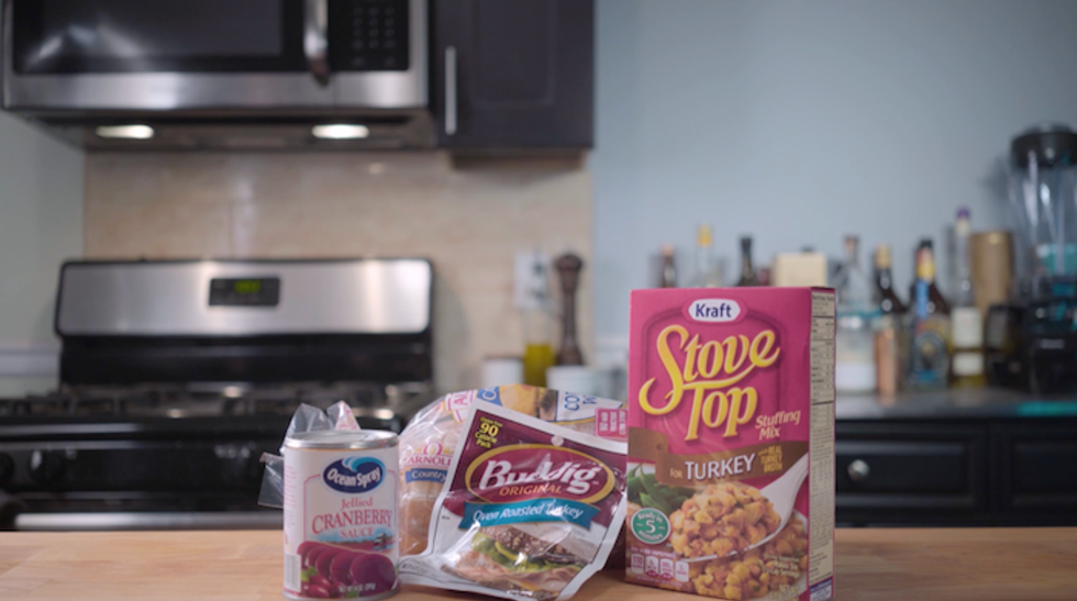 As a leftover lunch, ingredients include the usual suspects that were hopefully stored and sealed in separate Ziploc bags or Tupperware of choice in the fridge: Turkey, cranberry sauce, home-made sausage stuffing, gravy. Of course, don't forget the closure to seal the deal: White bread. However, what Rea shows is how to make the "Moist Maker" fresh and meant for consumption right away, instead of days later.