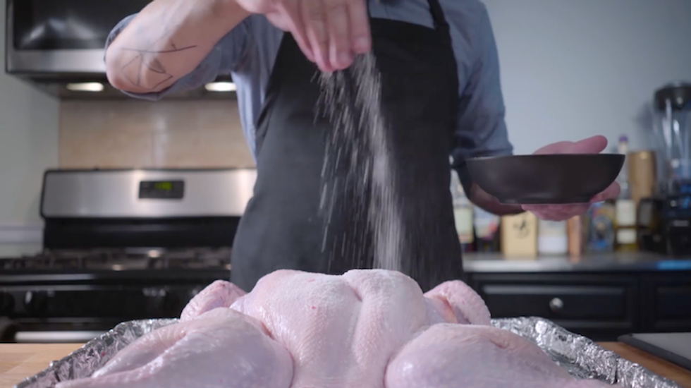 Rea takes us through each step, beginning with the initial prep of butterflying the turkey and drenching it in two tablespoons of baking soda to a cup of salt before storing the bird for 24 hours. "You want it to look kinda like a light snowfall," he says.