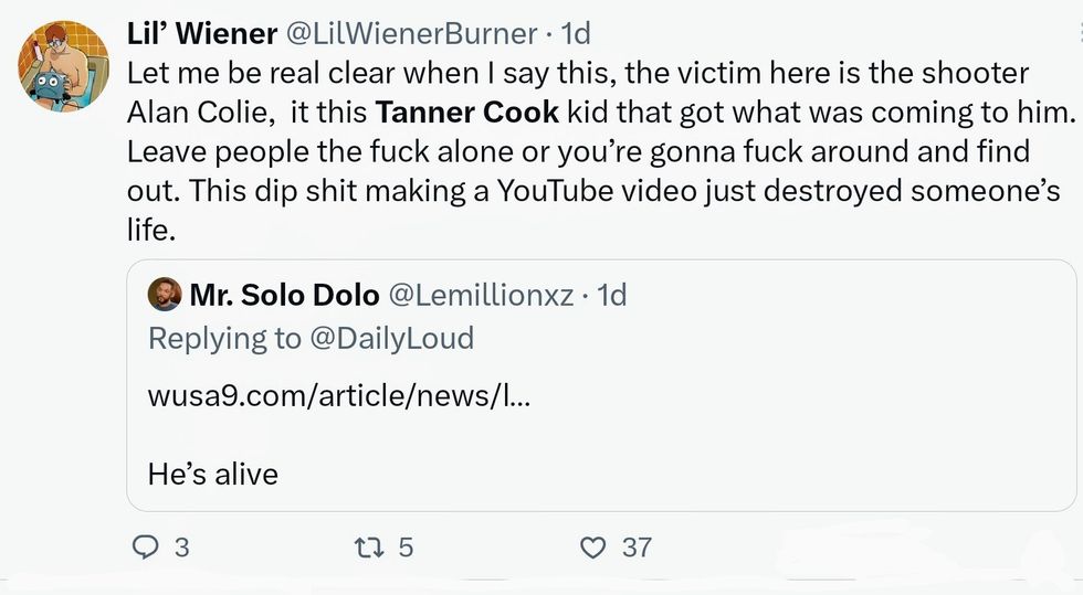 21-year-old Tanner Cook was filming a prank video on Sunday, April 2 in the Dulles Town Center shopping mall in Sterling, Virginia when he was allegedly shot in the abdomen by Alan Colie.