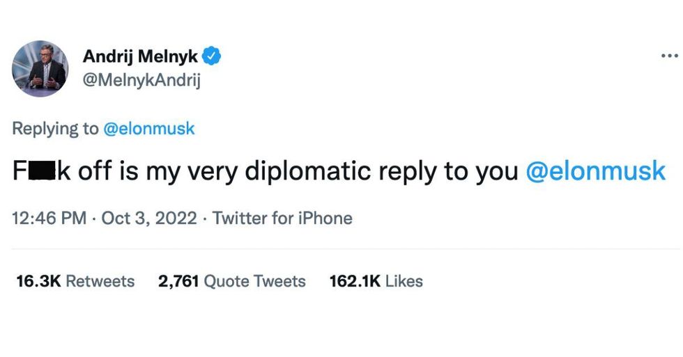 Taken together, Zelenskyy's clapback at Musk was exponentially kinder than many would manage--like, for example, Ukrainian diplomat Andrij Melnyk, who just ended his tenure as  the country's ambassador to Germany last week.