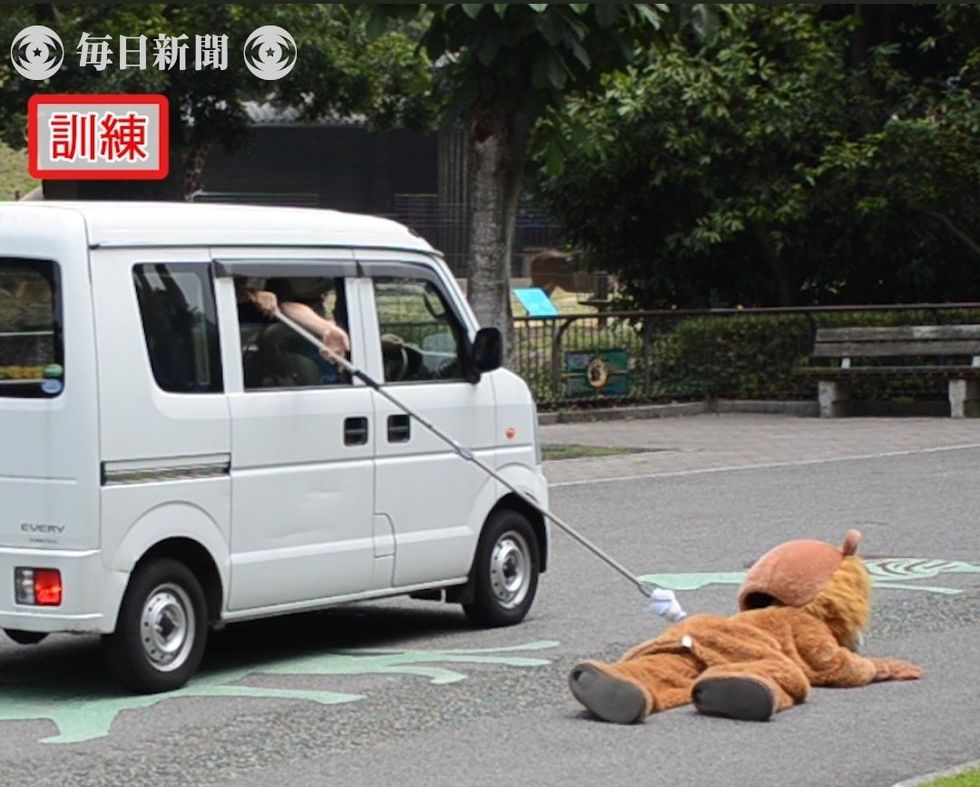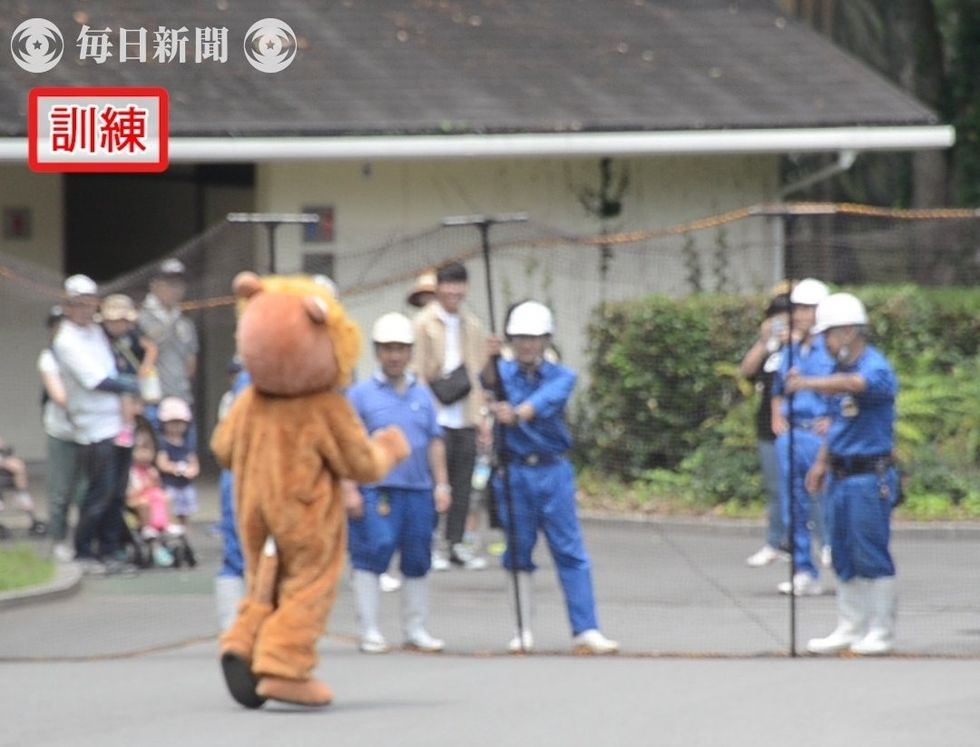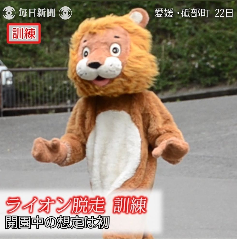 On Saturday, the Tobe Zoo in the Ehime prefecture in Japan ran a drill for their employees about what to do if a lion should escape. One employee dressed in a lion costume prowled around the park, as others took precautionary measures.